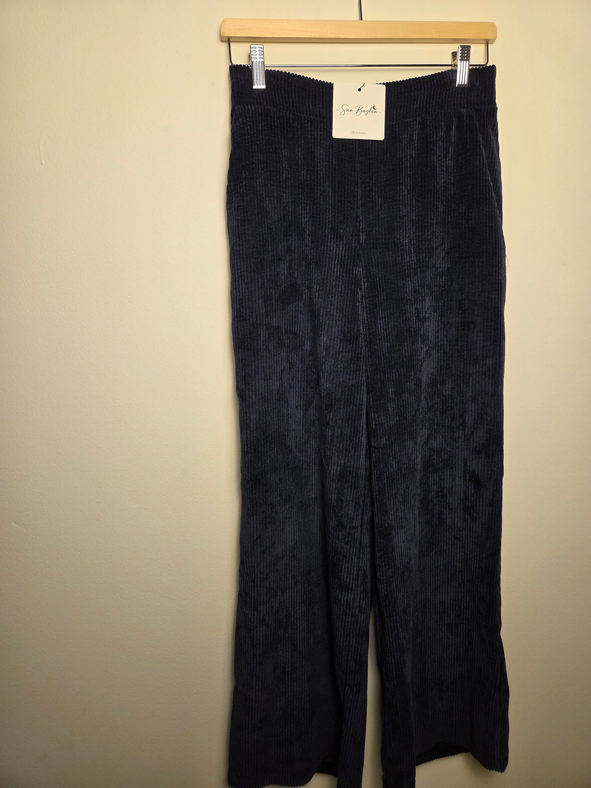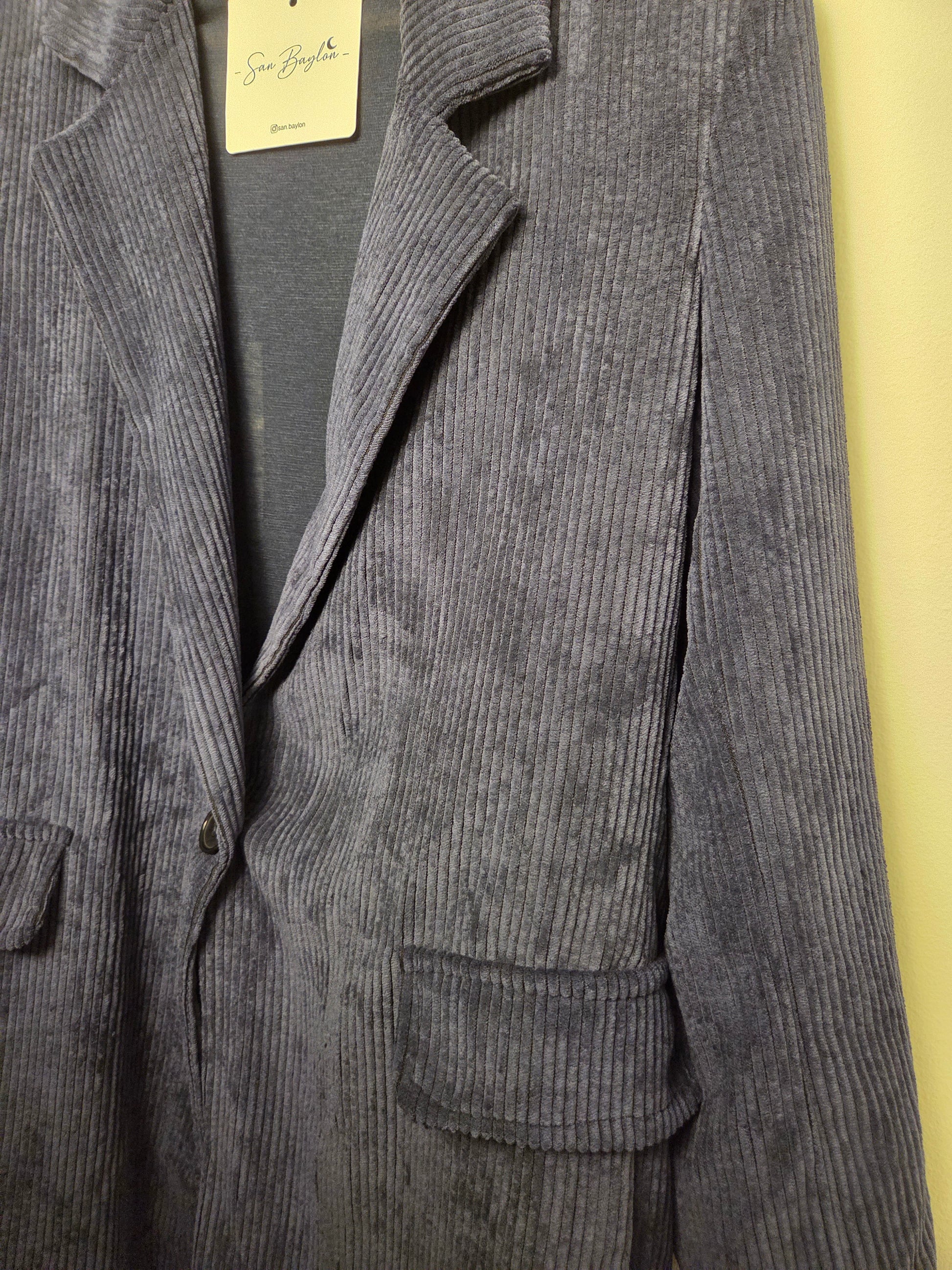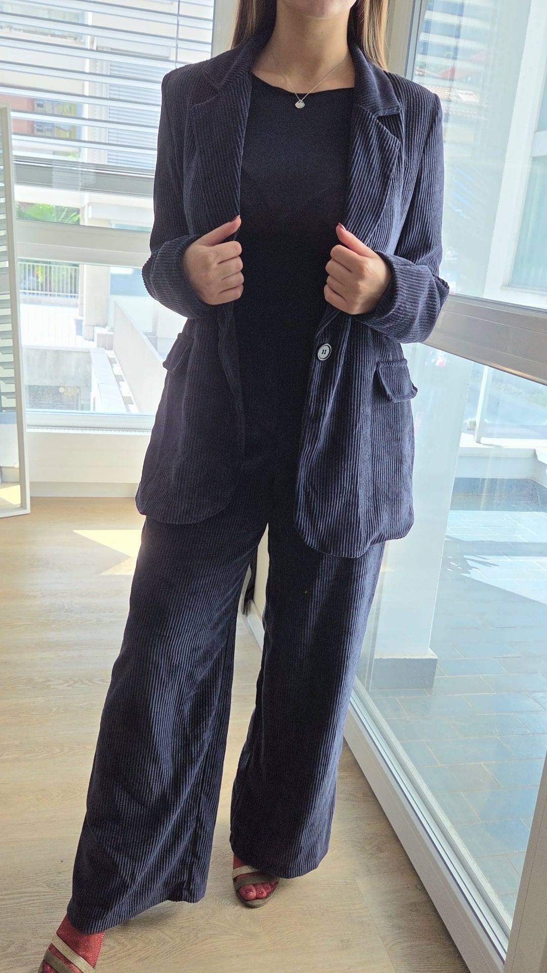 Completo velluto blu a coste TG unica. La modella indossare una 44.