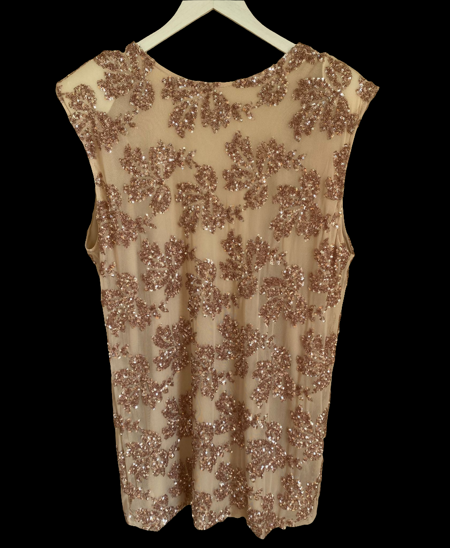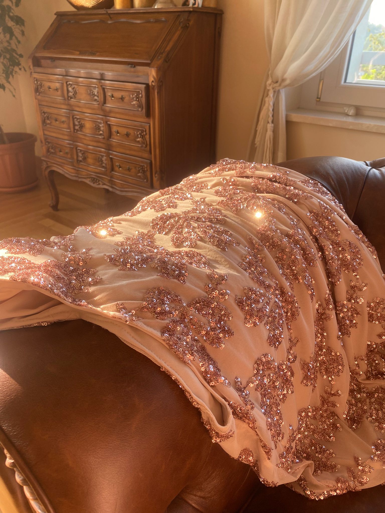 Abito in tulle nude ricamato con paillettes rosa dorate