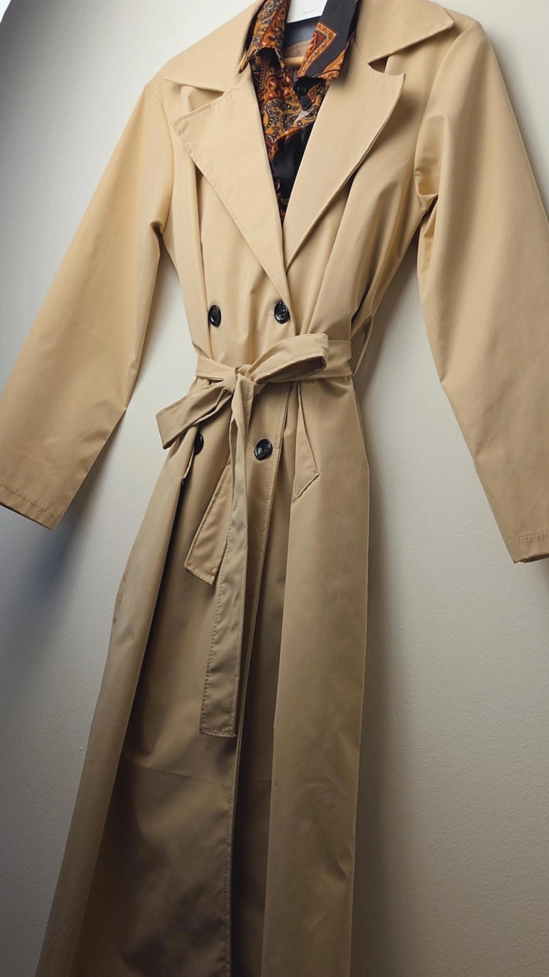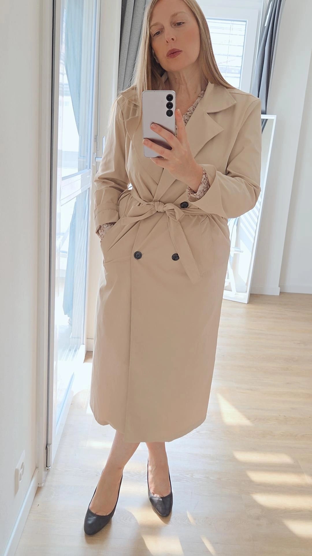 Trench leggero colore Beige vestibilità giusta. La modella indossa una 44